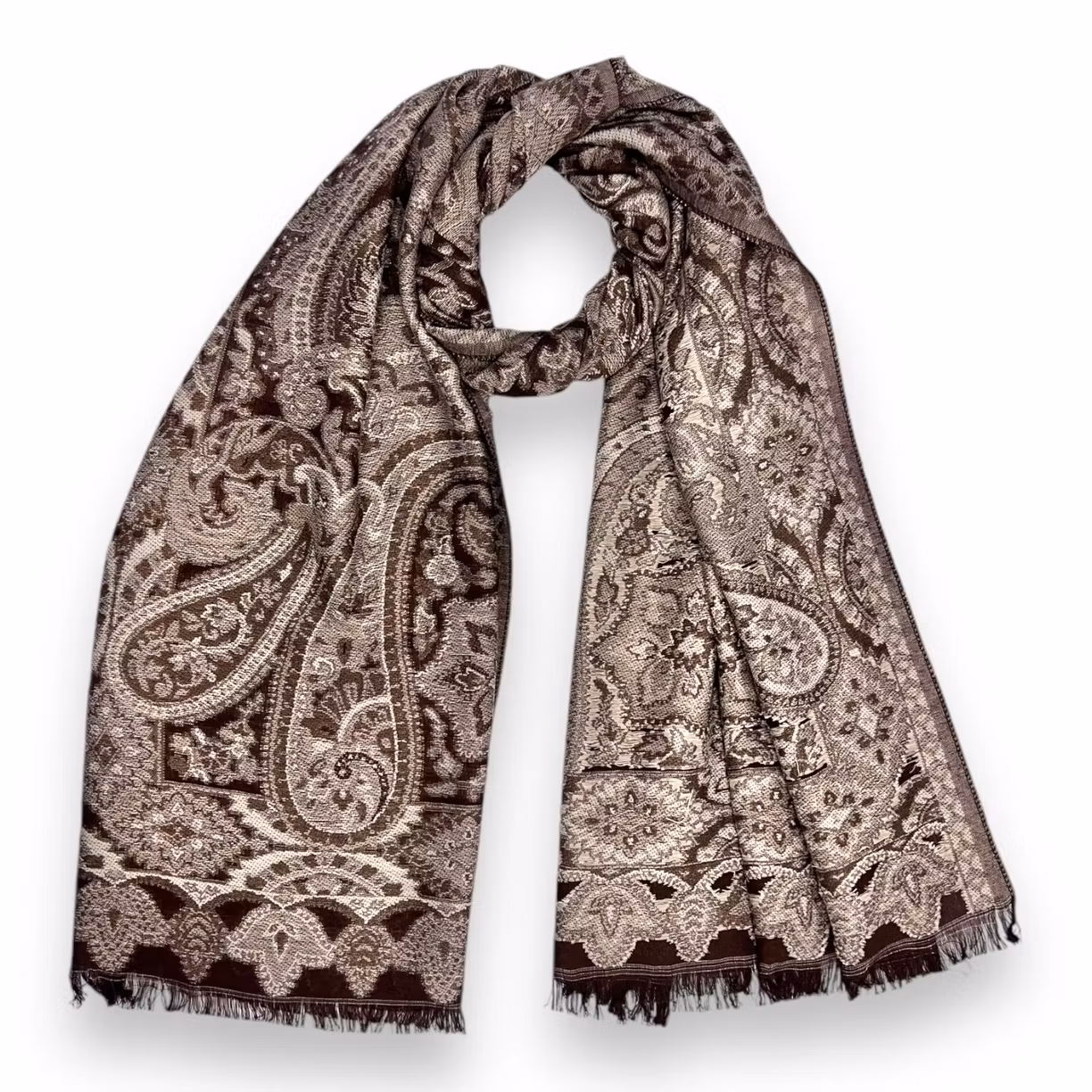 Det klassiska paisleymönstret möter en mjuk och följsam väv som faller vackert, oavsett hur du bär den. Med sina generösa mått på 180 × 85 cm kan du svepa den runt halsen, bära den som sjal över axlarna eller låta den bli ett blickfång till din favoritjacka.