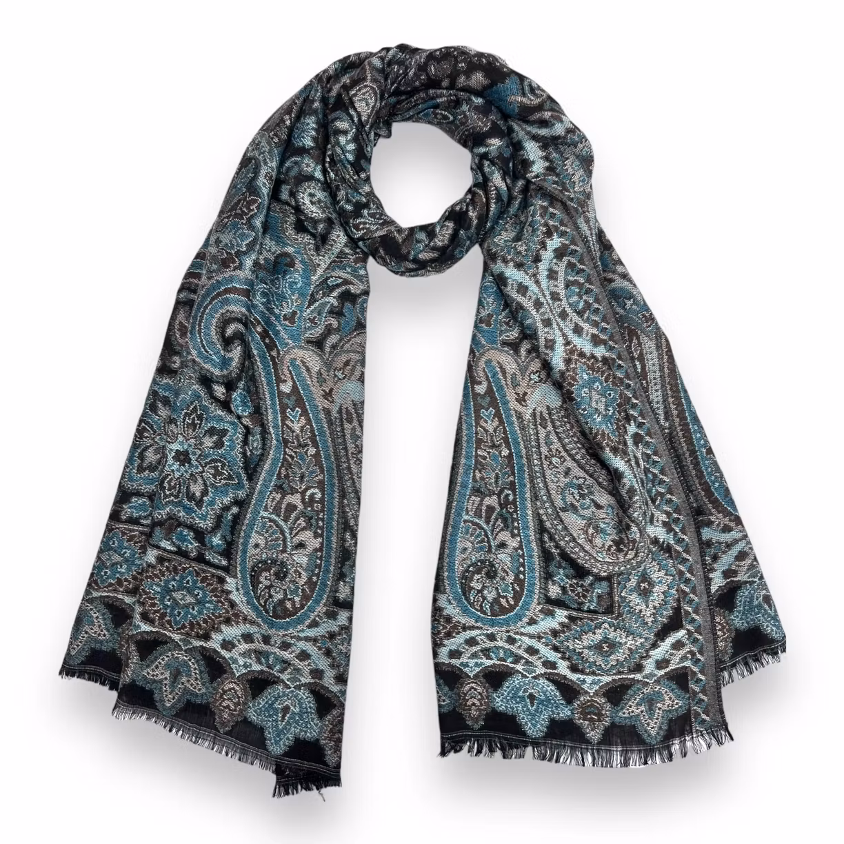 Det klassiska paisleymönstret möter en mjuk och följsam väv som faller vackert, oavsett hur du bär den. Med sina generösa mått på 180 × 65 cm kan du svepa den runt halsen, bära den som sjal över axlarna eller låta den bli ett blickfång till din favoritjacka.